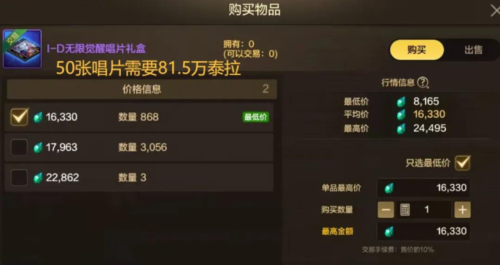 最初拍卖行1张无穷醒悟唱片(抽奖券)售价16.3万泰拉,需要50张才气拉满抽奖池,觉得需要破费81.5万泰拉!