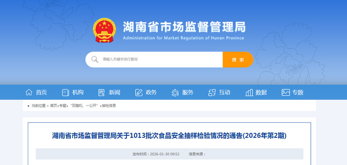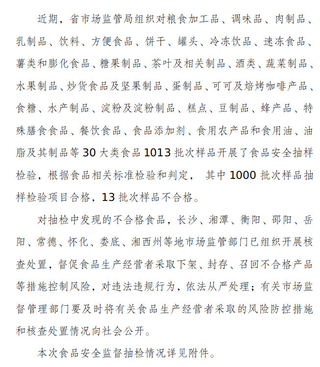 kpl投注app 湖南省市场监督管理局关于1013批次食品安全抽样检验情况的通告(2026年第2期)