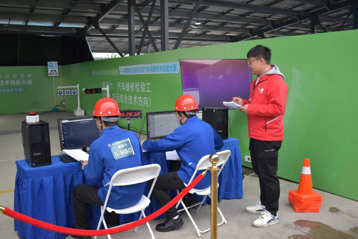 许王勇在第四届寰宇新能源汽车要道期间手段大赛担任汽车维修实践工赛项评判员