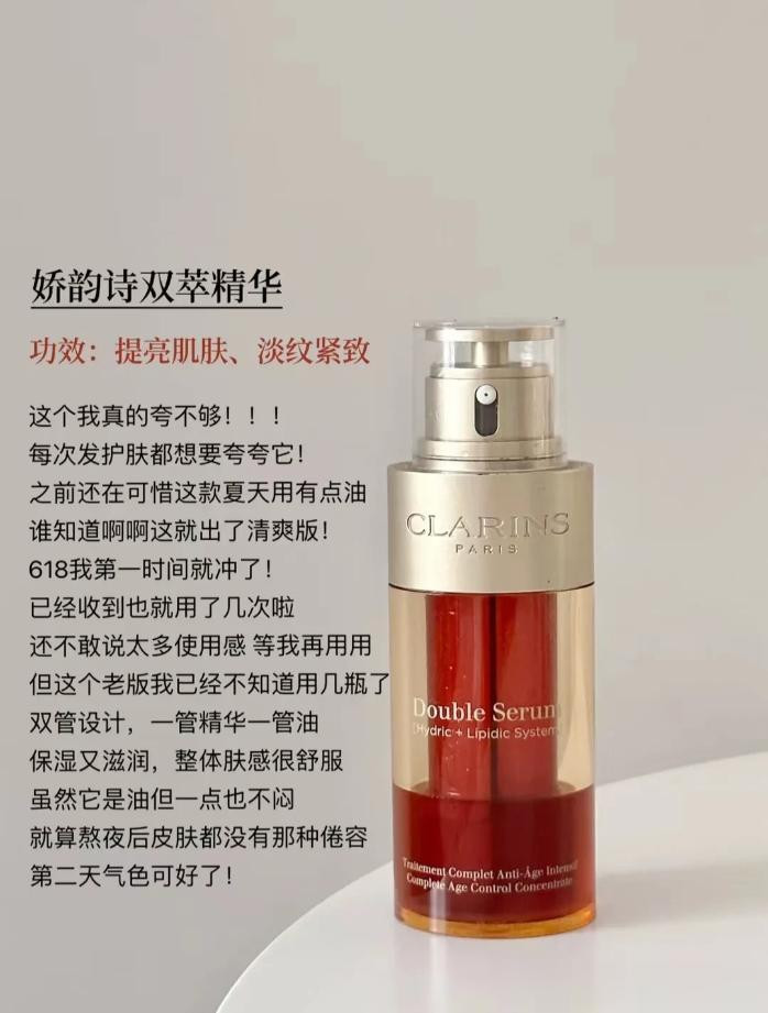主要作用是抗老维稳+精良滋养,嗅觉干皮东说念主手一只娇韵诗双萃,泛泛滋养维稳不出错选手,一到冬天就全标的爆皮的混干皮,双萃里的姜黄酮+雪绒花植萃,强强勾通舒徐肌肤,深度滋养干痒刺痛的脆弱脸。