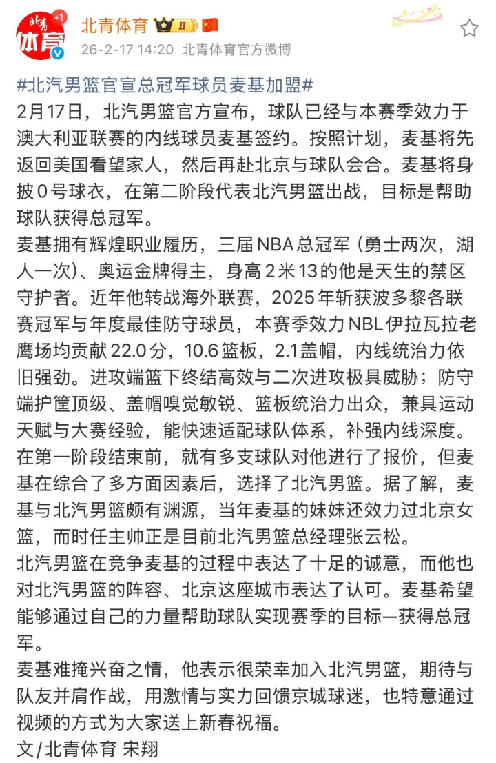 加盟北京男篮,麦基迥殊欣慰,录制了视频向北京球迷奉上新春道贺!首钢俱乐部在竞争麦基的经过中抒发了完全的赤忱,麦基也对北汽男篮的威望、北京这座城市抒发了招供,麦基但愿大致通过我方的力量匡助球队终了赛季的有计划—获取总冠军。