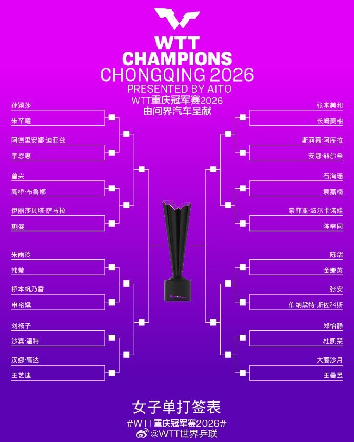 王者荣耀比赛投注 WTT重庆冠军赛女单签表: 首轮孙颖莎vs朱芊曦、王曼昱vs大藤沙月