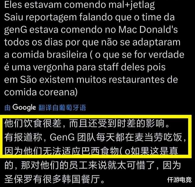 干系词兴味的是,当G2战队3:0横扫GEN战队后,韩网有种声息在为GEN战队的失利辩解,他们强烈商议说GEN队员在巴西的饮食条目很差,并且还会受到倒时差的影响,比如说队员们每天只可吃麦当劳,因为巴西菜不是太浓太咸,便是莫得滋味,牛牛游戏难以下咽。