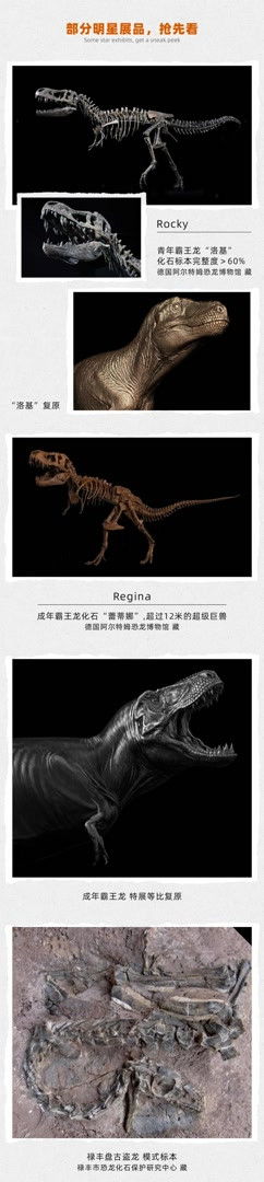 霸王龙是地球上有史以来最大的陆地捕食者之一,是名副其实的恐龙之王。展览还将提醒不雅众追寻霸王龙百年发现、商讨与久了环球文化的经由,全面融会霸王龙的演化经由与助长周期。