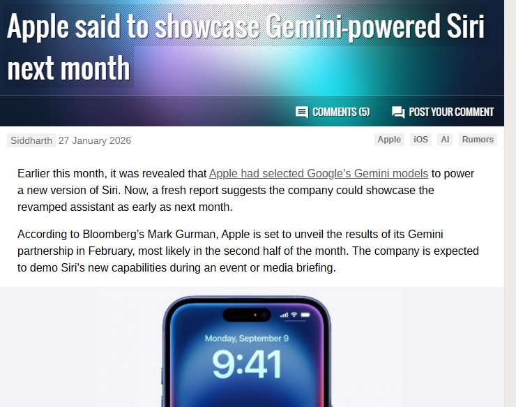 【环球网科技综合报道】1月28日,据外媒GSMArena报道,本月初,苹果选定谷歌Gemini模型重构Siri的消息曝光,引发行业广泛关注。彭博社记者马克·古尔曼最新爆料显示,苹果最快将于2月中下旬展示这场合作的成果,通过活动或媒体简报会演示新版Siri的核心能力,标志着这款经典语音助手正式迈入AI升级新阶段。