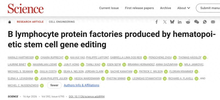 4月16日,《Science》的筹商报说念“B lymphocyte protein factories produced by hematopoietic stem cell gene editing”,筹商东说念主员高明地将基因裁剪时刻与免疫系统的当然扩增机制相诱骗,通过转变极少许的造血干细胞,告捷在动物体内构建了能够按需坐褥、自我扩增的B淋巴细胞卵白质工场。这项责任不仅为攻克HIV等恶疾提供了全新的念念路,更可能澈底重塑咱们真贵和调治要紧疾病的底层逻辑。