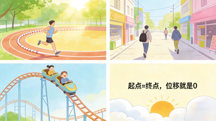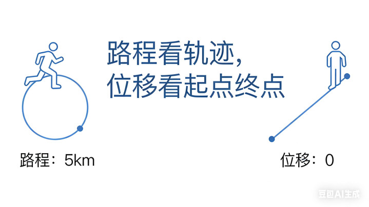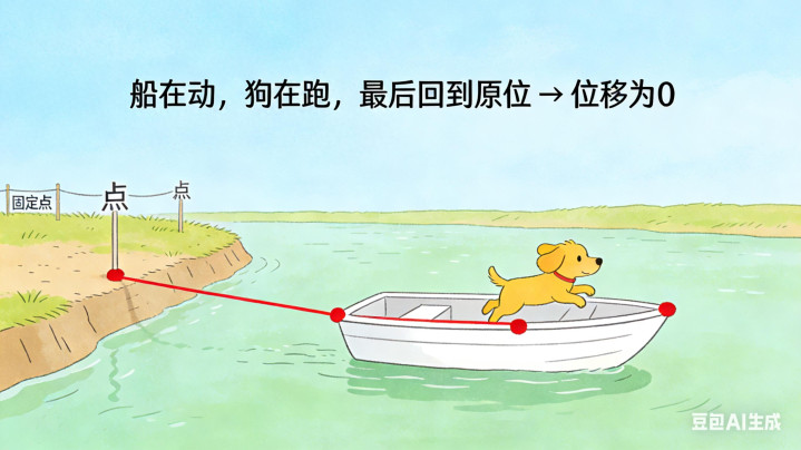 打个比喻,这就像你在跑步机上拼尽全力跑了一小时,累得满头大汗(路程很大),但你的位置长久没离开过房间(位移险些为0)。小狗的例子更秘要,因为它借助了“船在移动”这个外部参考系。