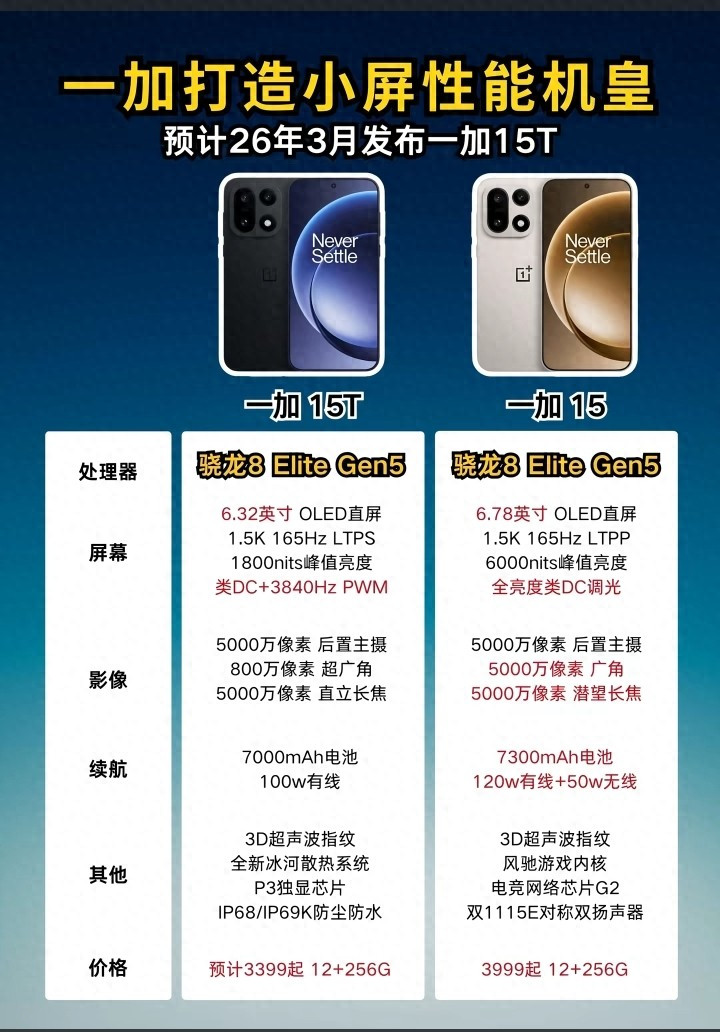 2026年。一加品牌行将推出两款备受瞩揣测打算旗舰机型。差异是展望于3月发布的一加15T和如故亮相的一加15。这两款手机均搭载了高通骁龙8 Elite Gen5芯片。在中枢肠能上保持了高度一致。为用户提供了顶级的运算能力和图形解决能力。议论词在屏幕、影像、续航和外围设置上。两款机型却展现出了截然相悖的假想念念路和定位。为破费者提供了各样化的遴荐。