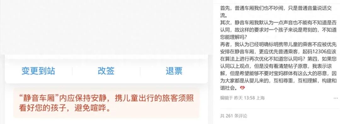 页面显示,标注“‘静音车厢’内应保持安静,携儿童出行的旅客须照看好您的孩子,避免喧哗。”该网友感到实在难安,“我家孩子属于安静的,但一点声音没有是绝对不可能的,这种该怎么办呢?”