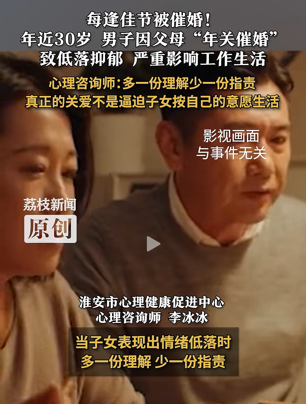 kpl外围投注 年近30岁男子因父母频繁催婚,导致情绪低落抑郁,严重影响工作生活,甚至不敢回家过年!心理咨询师提醒