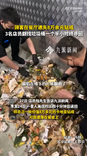 kpl外围投注 顾客丢8万元钻戒,3名店员翻找垃圾桶1个半小时寻回,店方:店员的手被竹签等杂物扎伤多处,客人已致谢