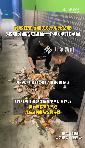 1月27日报道,浙江杭州某自助餐店内,因有顾客丢失钻戒,几位店员翻垃圾桶寻找。