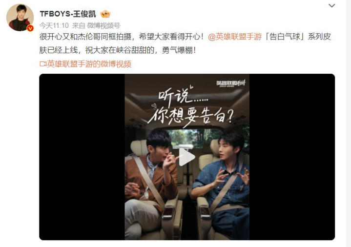 此前,王俊凯与周杰伦为勇士定约手游“广告气球”情东说念主节皮肤拍摄捏行短片。本日,王俊凯发文默示:“很昂扬又和杰伦哥同框拍摄。”据悉,片中王俊凯以“替一又友问”的款式,屡次向周杰伦请问广告技术、所在及失败应付措施。