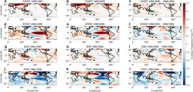 访佛的回转也出咫尺南亚和西欧。IOD方面,其在澳大利亚、非洲、亚洲和中东的遥联系幅度和空间结构均发生变化。PDO的遥联系在西欧和北好意思东部相同出现了美艳翻转。