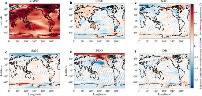 第二步是多元线性总结分析。规划团队逐网格点磨练五种骄贵模态各自遥联系效应在两个时段之间的相反,并评估这些相反联系于当然变率的统计权臣性。在95%权臣性水平下,人人约28%的网格点出现了与GMST(GlobalMeanSurfaceTemperature,人人平均名义温度)联系的权臣遥联系变化,ENSO和IOD鉴识影响了约20%和15%的网格点,PDO接近10%。NAO和SAM的变化比例只好3.4%和4.0%,接近立地预期,不外这更可能反馈面前骄贵款式对这两种模态的模拟精度不及,而非它们简直莫得受到影响。