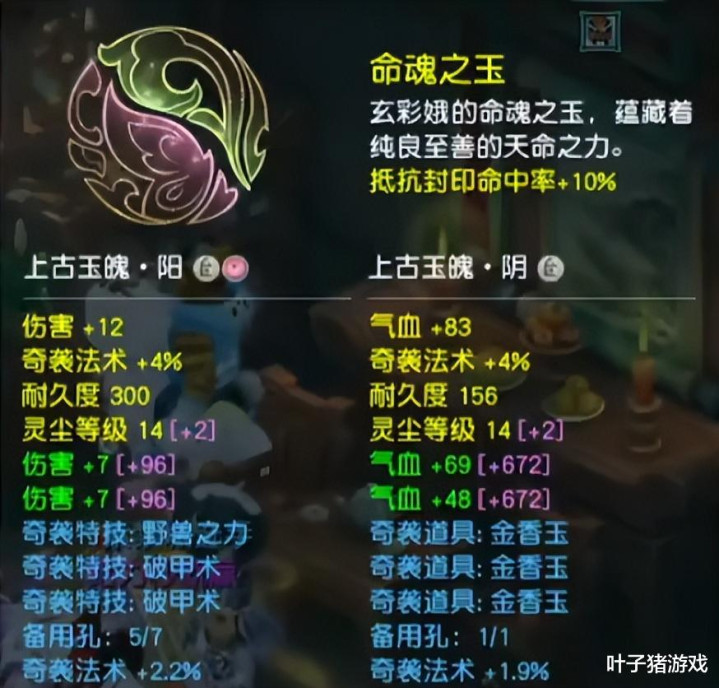阳玉魄为三伤害带2.2%奇袭法术几率,阴玉魄为三气血带1.9%奇袭法术几率。两者齐打了14级五色灵尘,照旧是毕业级宝玉,能称霸武神坛许久的时分。