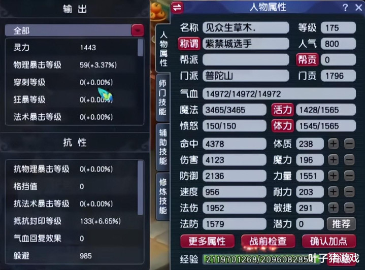 侯总力普陀接近全力加点的属性,具备14972点气血、4123点伤害以及956点速率。此外还附带3.37%物暴几率,输出异常炸裂。